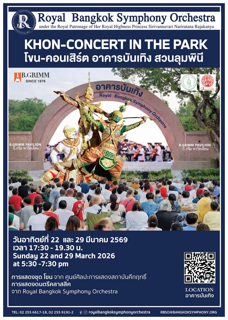 Due to the overwhelming popularity and enthusiastic audience response, the Royal Bangkok Symphony Orchestra with the support of B. Grimm and the Bangkok Metropolitan administration is delighted to announce two additional performances of Khon-Concert in the Park. This unique open-air event brings together the grandeur of a full symphony orchestra with the elegance and dramatic storytelling of Thailand’s traditional Khon masked dance. This will be performed by artists at the Kukrit Institute of Performing Arts Center.