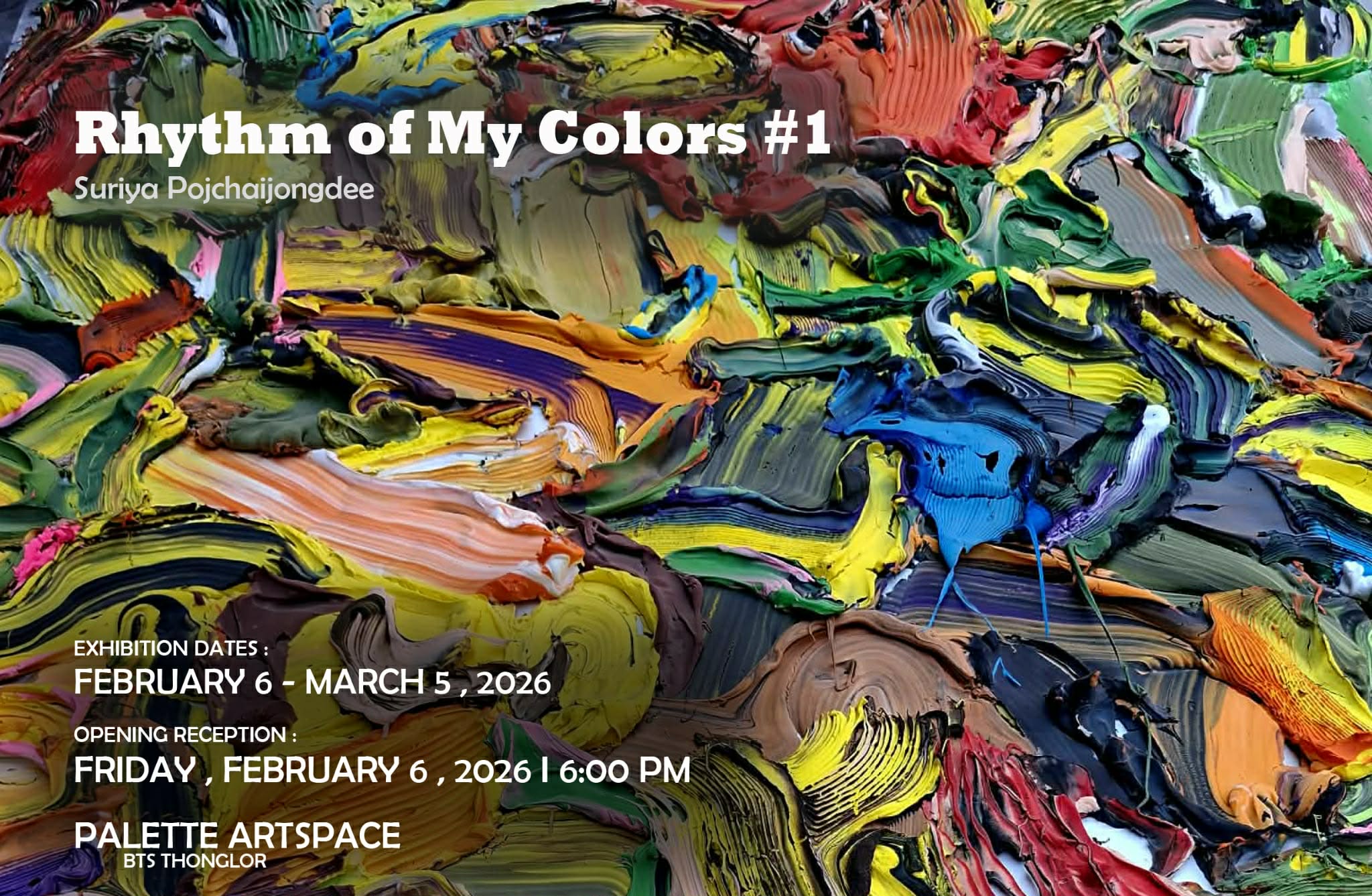 In terms of visual art, each time I apply color, it simultaneously creates the physical presence of lines, colors, weight, shapes, and textures. My drawing process is like improvising visual elements without any pre-planned design, allowing my mental state to guide the creation toward its aim. Applying brushstrokes with a larger mass of color than usual, quickly and confidently, produces textures that are unusually raised and deep, generating attraction and stimulating emotions through the rawness of the visual elements that appear suddenly. It leaves traces of thought and feeling without a narrative, traces of movement direction in slow and fast motions, and moods in the color shades, inviting viewers to emotionally engage with the work without reasoning. One simply needs to freely release their feelings and imagination with the piece; that is the Rythm of my colour#1 for me.
